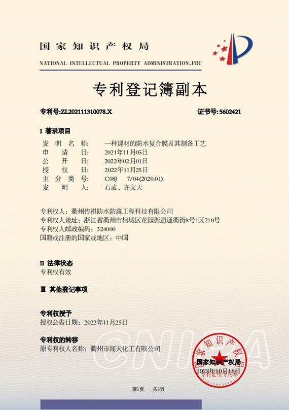衢州傳祺新材料科技有限公司是衢州市聞天化工有限公司的下屬企業;衢州市聞天化工有限公司成立于2003年,是國內最早研發、生產氟碳涂料的企業之一。衢州傳祺新材料科技有限公司成立于2017年,公司專注于高分子氟材料的開發和含氟材料在防腐、防水領域的應用。經過6年的不懈努力,已獲得了化工和建筑領域六項國家發明專利授權和兩項新產品科技成果獎,參與了中國建筑材料流通協會《房屋修繕防水工程規范》標準的編制工作,中建協涂裝委員會浙西工作站設立在我公司。